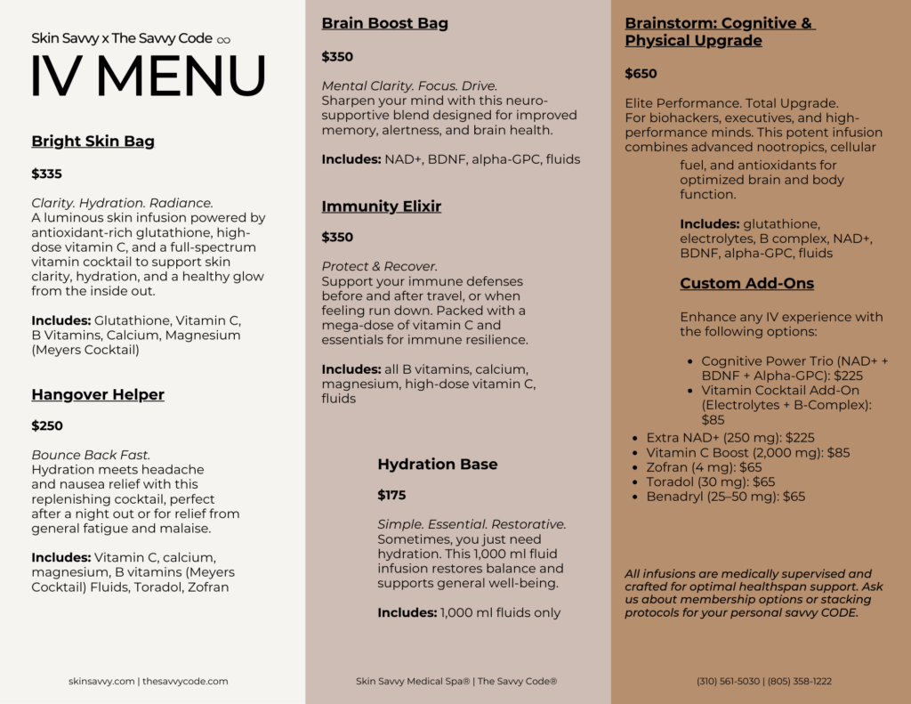 - Delivering NAD+ and BDNF boosters to support neuroplasticity, memory retention, and cognitive clarity.